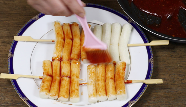 5. 튀겨놓은 떡꼬치에 준비한 소스를 골고루 발라주면 떡꼬치 완성입니다.