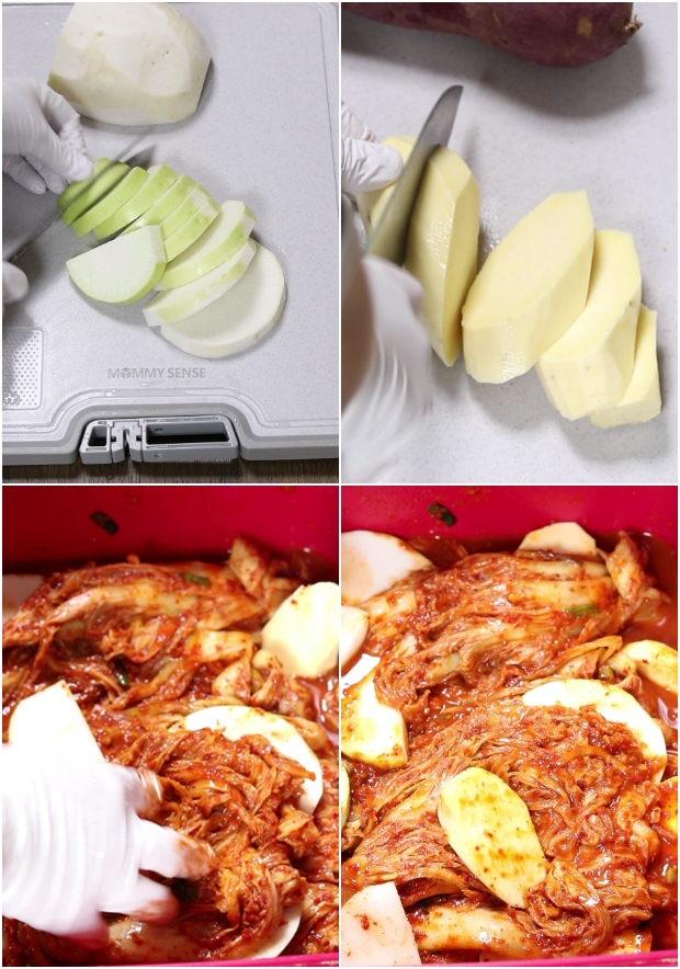 김치가 짜면 무나 고구마를 썰어서 (고구마는 썰어서 찬물에 담궈 녹말기 제거하기)