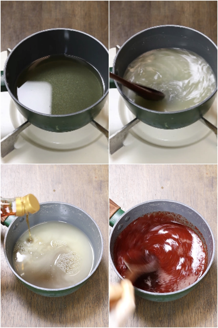 냄비에 물이나 멸치다시마육수에 찹쌀가루를 넣고 찹쌀풀을 만들어줍니다.