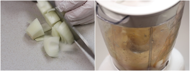2. 양파1/4개를 토막내어준후 믹서기에 넣고 배즙1봉지(100ml짜리)를 넣고 갈아줍니다.