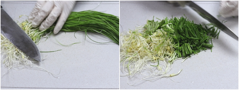 2. 세척한 달래의 알뿌리부분을 칼등으로 살살 두드려준후 2cm정도 길이로 썰어줍니다.