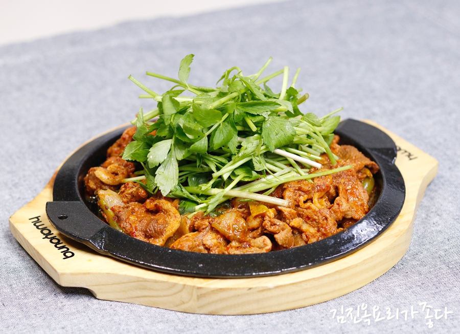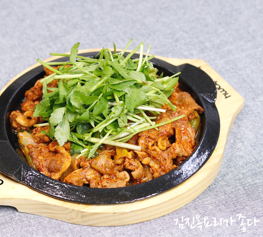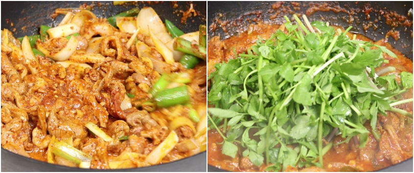 ***오리불고기 볶을때 오리고기가 다 익었을때 미나리 또는 부추 또는 깻잎을 넣고 곁들여