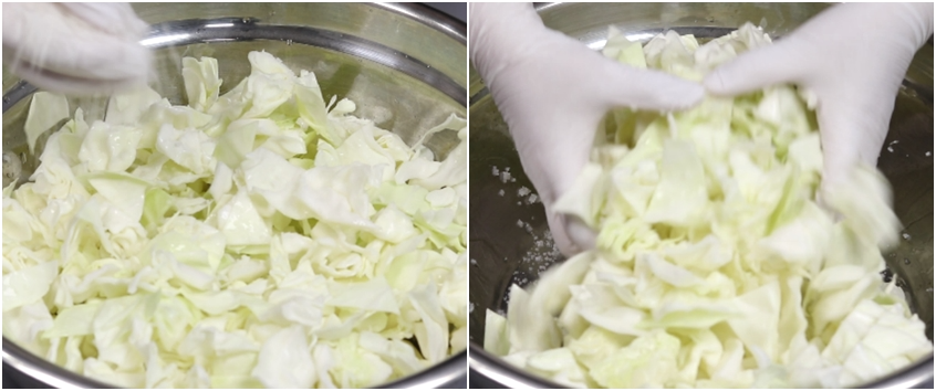 다시 양배추 넣고 소금뿌리고를 반복합니다.