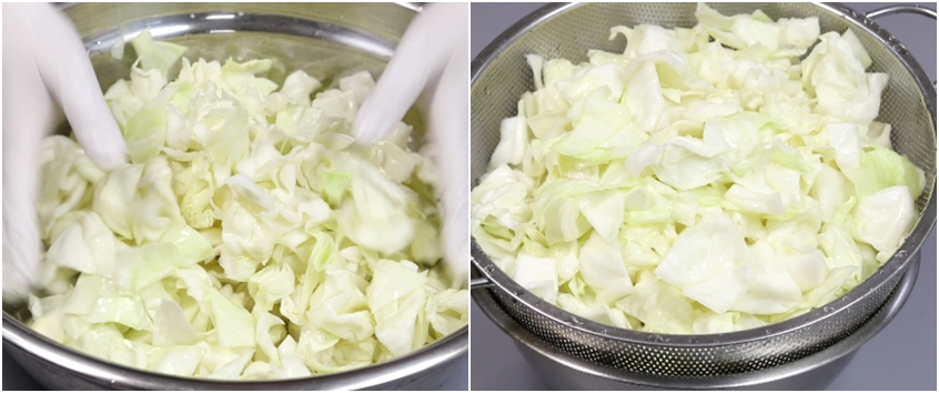 5. 30분절여진 양배추를 세척하고 체에 받쳐 물기를 빼줍니다.