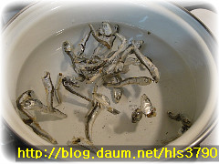 1. 냄비에 물을 8컵을 부은후 국물용 굵은멸치를 한줌 넣고 10분정도 끓여줍니다.
