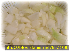 양파도 1cm*1cm길이 정도로 썰어서 찬물에 한번 헹구어 소쿠리에 받쳐줍니다.