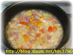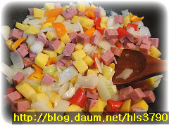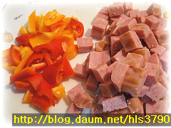 여기에 햄. 파프리카를 넣어주시고 1분만 더 볶아주세요...