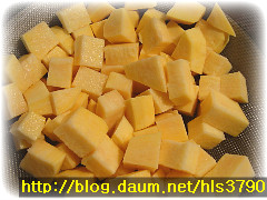 1. 고구마는 깍두기 모양으로 썰어서 찬물에 잠시 담궈놓았다가 소쿠리에 받쳐