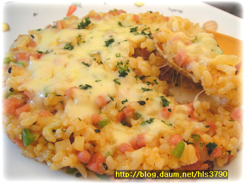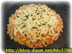 짜잔~~ 어떠세요?? 근사하죠?? 밥을 볶은후 후라이팬에 피자치즈 뿌리고