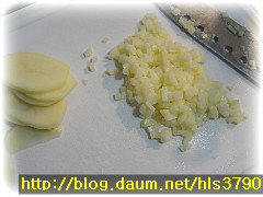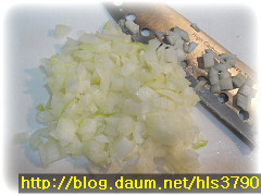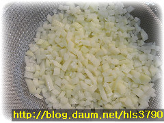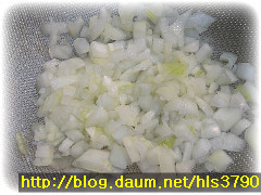 양파도 감자처럼 잘게 썰어서 찬물에 한번 담궈 매운향을 제거후 소쿠리에 받쳐
