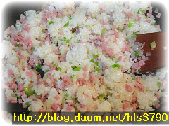 재료(2인분) : 밥 국그릇으로 1공기. 양파1/2개. 감자1개. 피망1/2개. 햄100g정도.