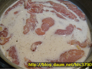 닭안심에 다진마늘1T+소금1/2T+후추가루1/5T+우유( 닭살이 잠길정도의 양)을 넣고