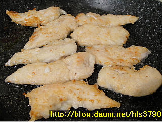3. 후라이팬에 식용유를 두르고 녹말가루 입힌 닭안심을 노릇하게 구워주세요~~