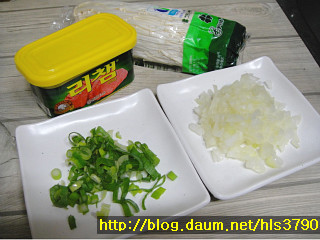 재료: 햄200g. 팽이버섯1봉지.양파1/3개. 다진파2T.계란3개. 소금.식용유