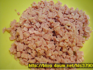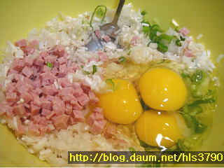 햄.팽이버섯.양파1/3개를 곱게다져주세요...볼에 다져놓은 햄과 팽이버섯.양파.다진파2T를 넣고..