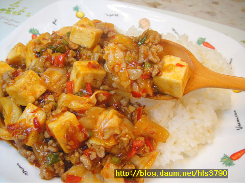 완성접시에 밥을 담고 그 위에 마파두부를 올려주시면 됩니다....