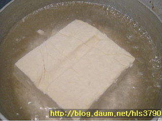 4. 두부는 끓는물에 넣어 데쳐낸후 먹기 좋게 썰어줍니다.