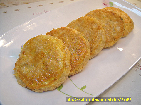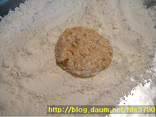 버무린 반죽을 동글한 모양으로 넓게 편후 밀가루를 묻히고 계란물을 묻힌후 식용유를 두룬 프라이팬에