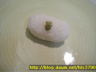 5. 배합초를 넣은 밥을 동글길쭉하게 초밥모양으로 만든뒤 연와사비를 콩알크기로 밥위에 올린뒤...