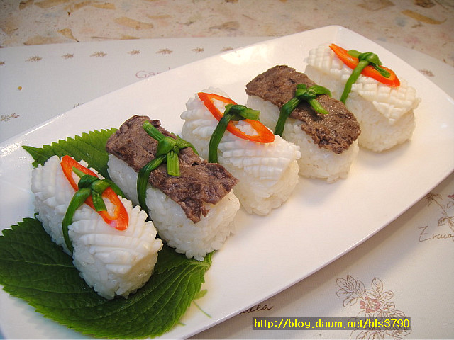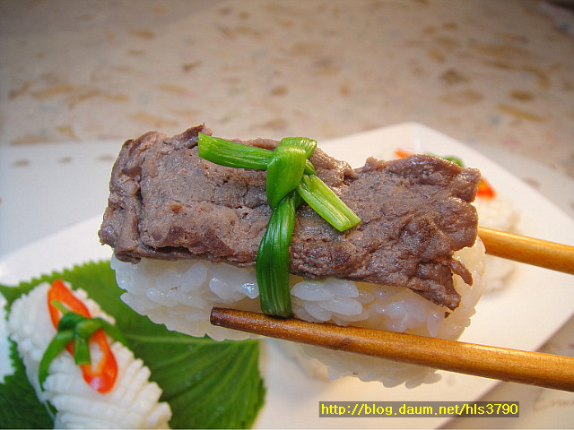 쇠불고기도 같은방법으로 만들어주세요... 초밥의 모양을 잡을 때는 손에 묻지 않게 물을 손에 묻혀가며
