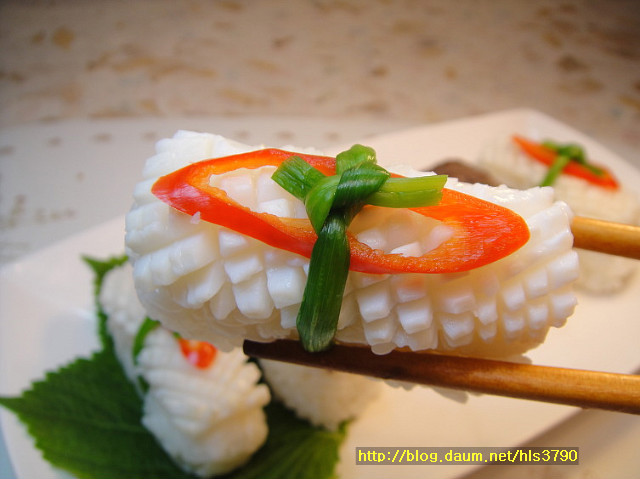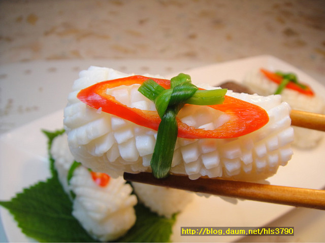 오징어를 올리고 홍고추를 올린후 미나리줄기 데친것으로 잘 말아 묶어주세요...