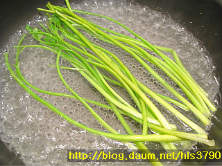 1. 미나리 줄기만 15개정도를 잘 손질후 끓는물에 소금을 넣고 10초만 넣었다가 뺀후 찬물에 헹구워 소쿠리에