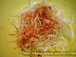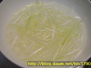 2. 대파의 흰부분만 곱게 채썰어주세요...채썰은후 찬물에 10분정도 담궈주세요....( 매운향 제거)
