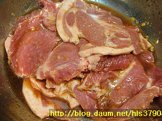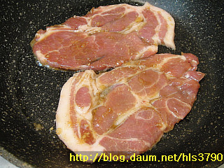 ==> 팬에 고기를 올린후 양념을 수저로 2T정도 끼얹어서 중약불로 구워주세요~~