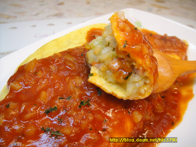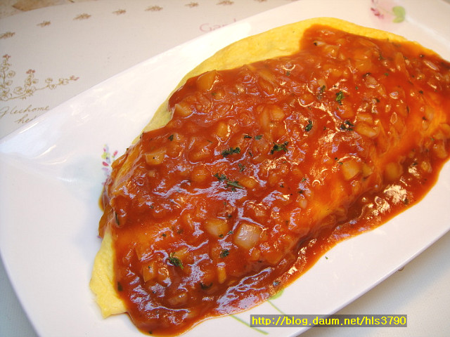 접시에 오므라이스 담으시고 그 위에 소스를 뿌리시면 됩니다~~