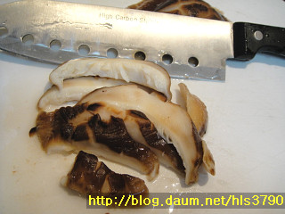 데친 표고버섯을 0.3cm정도의 두께로 썰어주세요...썰은후 물기를 살짝 손으로 눌러 짜준후
