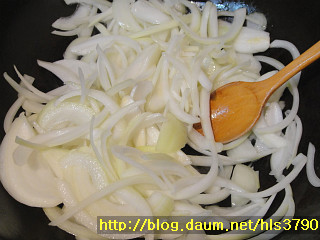 5. 재료볶기: 채썰은 양파를 볶음팬에 식용유1T를 넣고 소금약간(밥알크기만큼양)만 넣은후