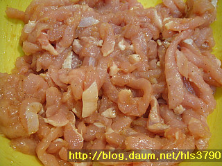 돼지고기에 다진마늘1/2T+참기름2/3T+진간장2T+올리고당1T(또는 물엿)+후추가루를 넣고 20분정도 재웁니다.