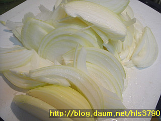 양파 2개를 0.5cm정도의 두께로 채썰어주세요~