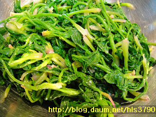물기를 빼줍니다... 물기를 손으로 꼭 짠후 다진마늘1/2T+ 깨1T+ 참기름1T+ 소금1/2T를 넣고 버무립니다.
