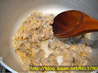 4. 냄비에 참기름 1T를 넣고 바지락을 30초정도 볶아줍니다..여기에...