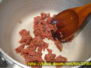 5. 냄비에 참기름 1T정도를 두룬후 쇠고기를 먼저 볶아줍니다..쇠고기의 표면이 하얗게 변하면