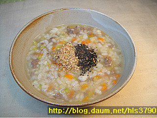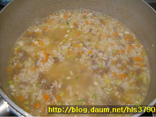 ==> 밥알이 많이 퍼진 죽을 원하실경우에는 육수를 더 부어주시고요...중간에 육수를 부으실경우에는