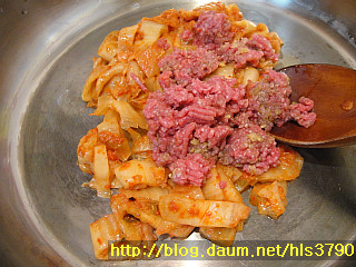 5. 큰 전골냄비에 참기름1T를 두룬후 양념에 재운 쇠고기와 익은김치를 넣고 볶아주세요...(중불로)