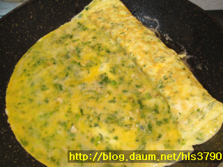 프라이팬에 소량의 참기름을 두룬후 팬이 달아오르면 계란물과 부추를 넣어준후 중불에서