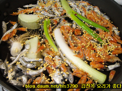 마른새우 1주먹. 대파1개.통무1조각. 대파뿌리3~4개. 고추씨3T를 넣고 센불로 켜서 끓어오르면 중불로 줄이고