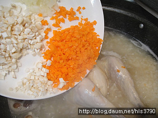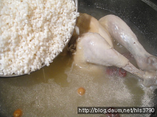 국물에는 닭과 대추와 은행만 놓고 불린찹쌀을 넣어줍니다...불린찹쌀을 넣고 10분정도 끓여줍니다..