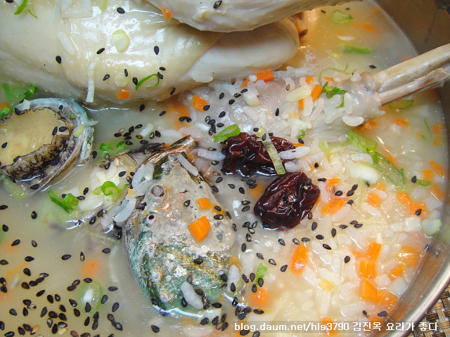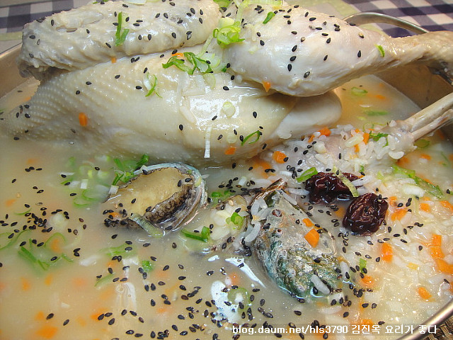 ==> 완성된 백숙을 전골냄비에 담아 죽과 함께 국물을 넣고 깨. 다진파. 검은깨를 뿌려서 드시면 됩니다..