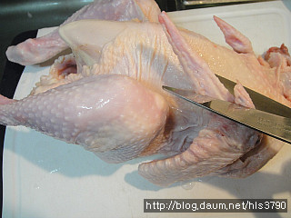 1. 토종닭1마리를 준비합니다... 토종닭의 날개끌부분을 가위로 자른후 찬물에 씻어줍니다...