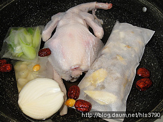 재료(4인분): 토종닭1마리. 전복3마리. 한방백숙용팩1팩. 대파1개. 양파1개. 당근1/2개.