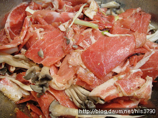 재료: 돼지불고기거리 600g, 숙주2주먹. 미나리1주먹. 참타리버섯1팩. 대파1개.