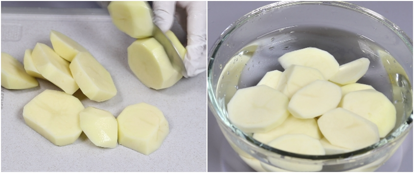 2. 껍질제거한 감자는 1cm 두께로 썰어준후 찬물에 담궈 녹말기를 제거합니다.