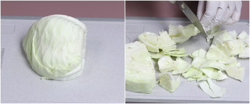 1. 양배추1/4통 토막내서 먹기 좋은 크기로 잘라줍니다.
