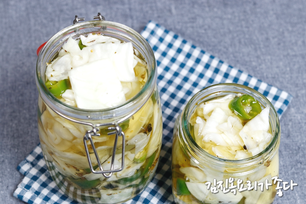 재료:양배추1/4통(500g). 오이맛고추3개~4개(큼직한것으로). 물700ml. 굵은소금3T.설탕250ml. 식초250ml.