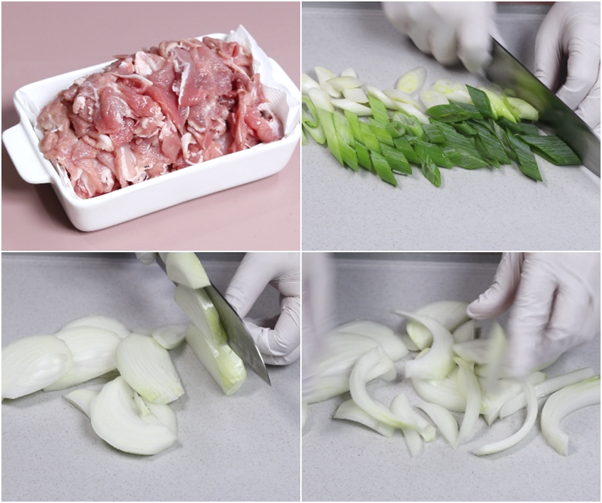 재료(4인분): 돼지고기 앞다리살600g. 양파1/2개. 대파2/3개정도. 다진마늘1T.식용유1T.