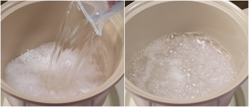 재빨리 찬물800ml를 부어준후 골고루 섞어줍니다.